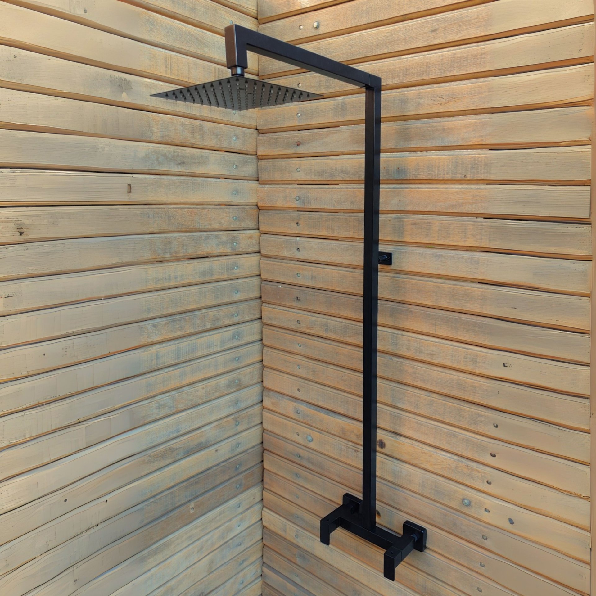 Ducha para area externa e interna de meia parede de tubo quadrado, crivo de 30x30cm de diâmetro no acabamento preto semi-brilho.