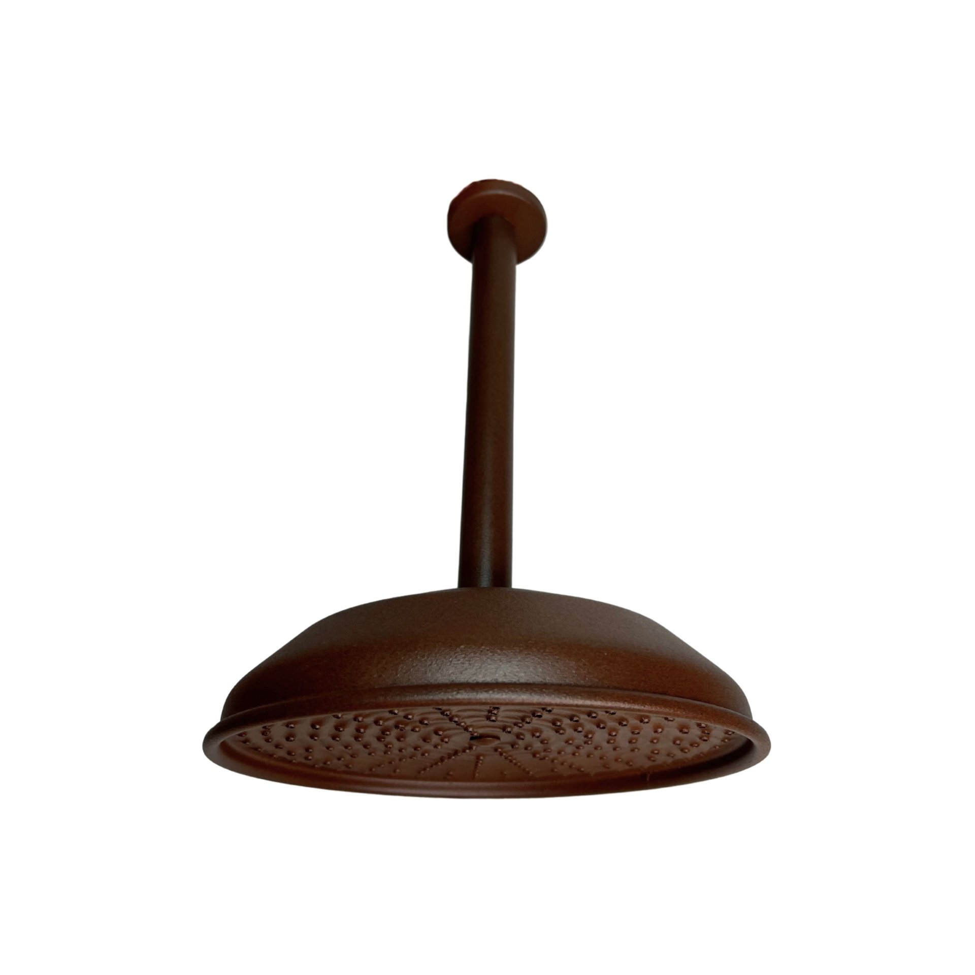 Ducha de teto com 18 cm de diâmetro com alto desempenho e durabilidade. Acabamento Aço Cortem.