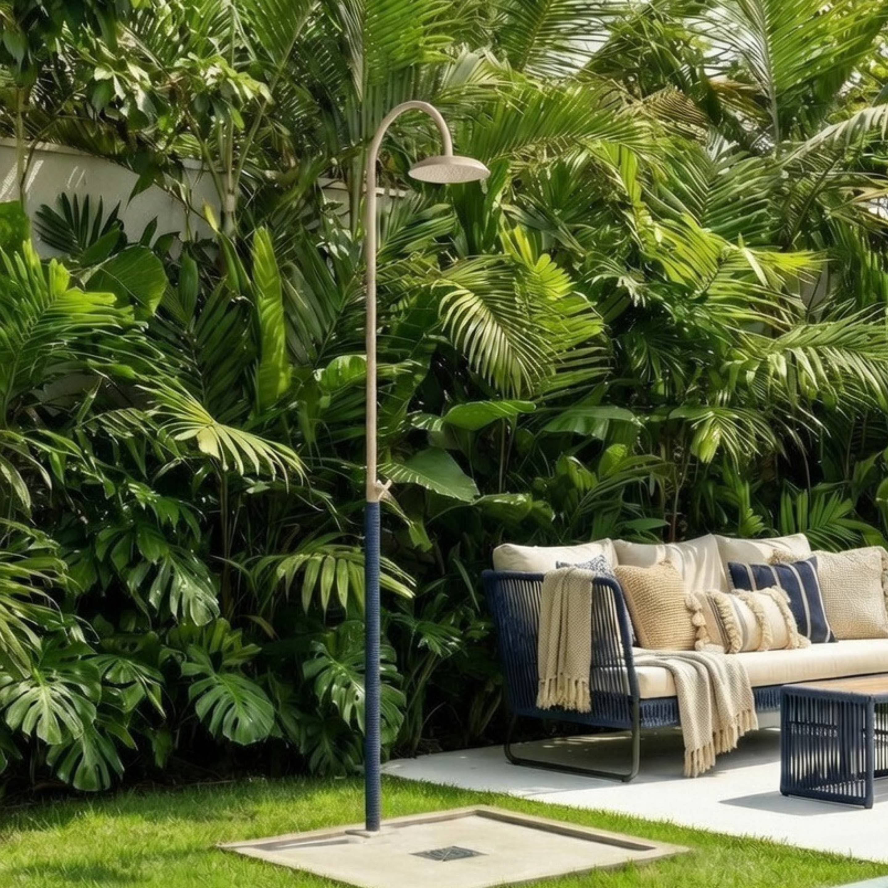 Descrição da foto: Ducha para area externa de agua fria no acabamento bege marfim, crivo de 25cm e detalhe em corda nautica azul marinho