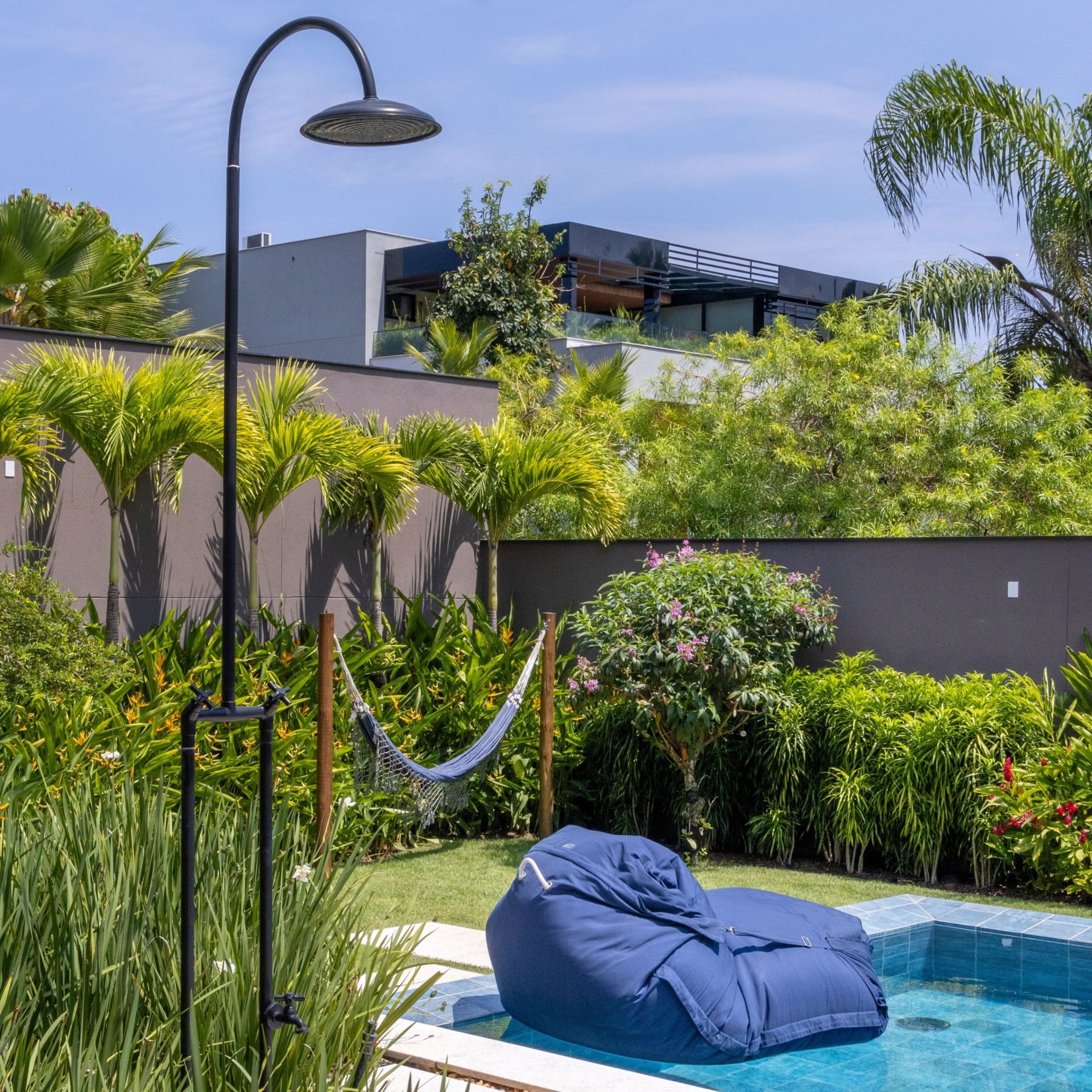 Ducha para area externa de piso com agua quente e fria, braço em arco no acabamento preto semi-brilho, com opcional de torneira lava-pés e crivo de 18 cm de diâmetro.