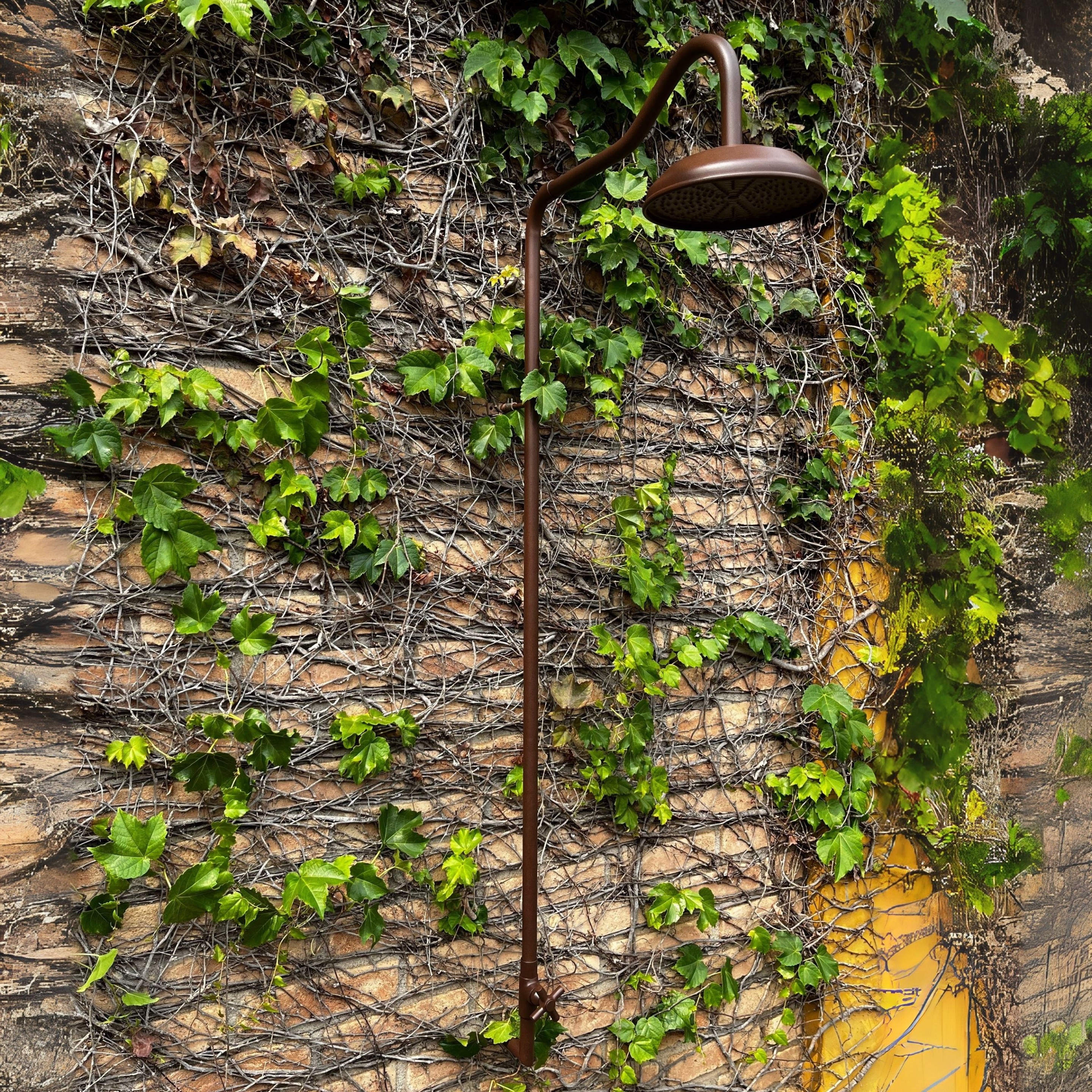 Ducha de meia parede com braço arqueado estilo colonial, crivo de 18 cm de diâmetro no acabamento marrom cortem.