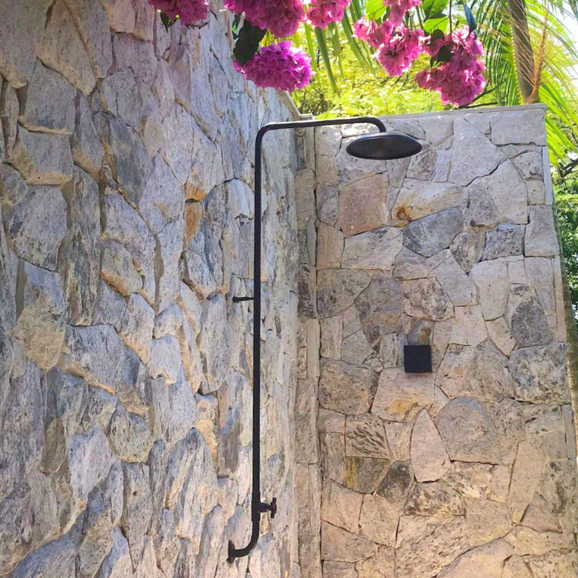 Ducha para area externa de meia parede com braço reto, crivo de 18 cm de diâmetro no acabamento preto semi-brilho.