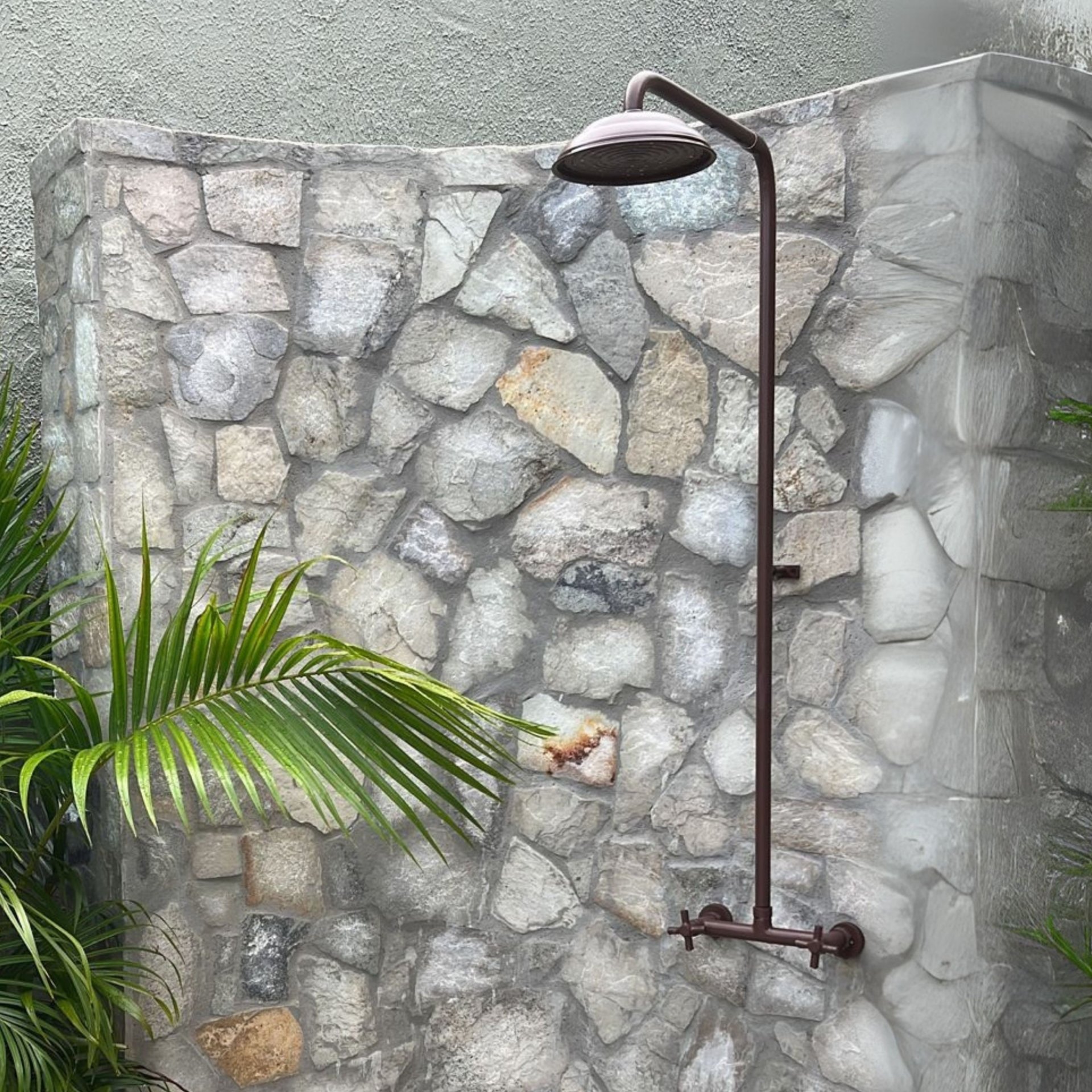 Ducha para area externa de meia parede com tubulação externa, misturador para água quente e fria no acabamento aço cortem e crivo de18 cm de diâmetro .