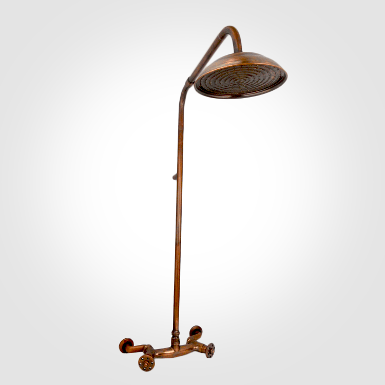 Ducha redonda de 18 cm de diâmetro com tubulação externa e misturador para água quente e fria. Acabamento Cobre Velho.