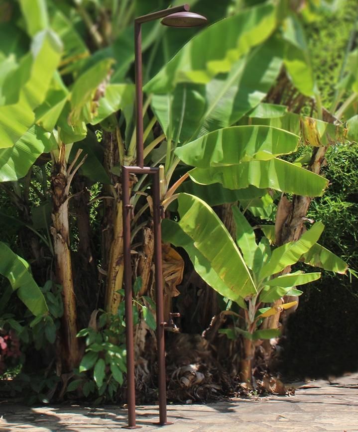 Ducha de piso com crivo de 25 cm de diâmetro e braço reto. A ducha possui tubulação externa com 1" e 1/2 e torneira de lava-pés. Disponível em 3 opções de tamanhos de ducha.
