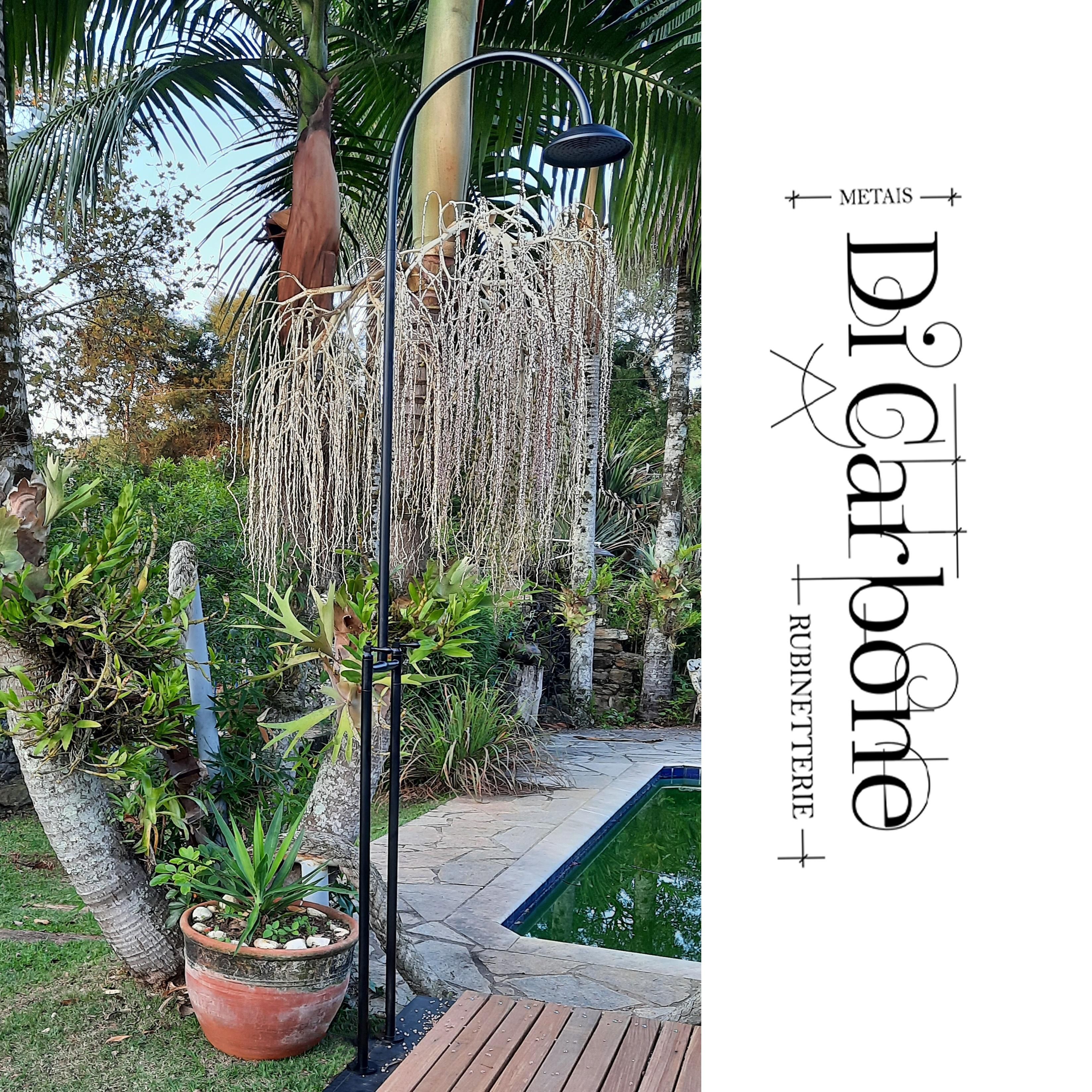 Ducha de piso com crivo de 18 cm de diâmetro e braço em arco. A ducha possui tubulação externa e água quente e fria. Disponível em 3 opções de tamanhos de ducha.