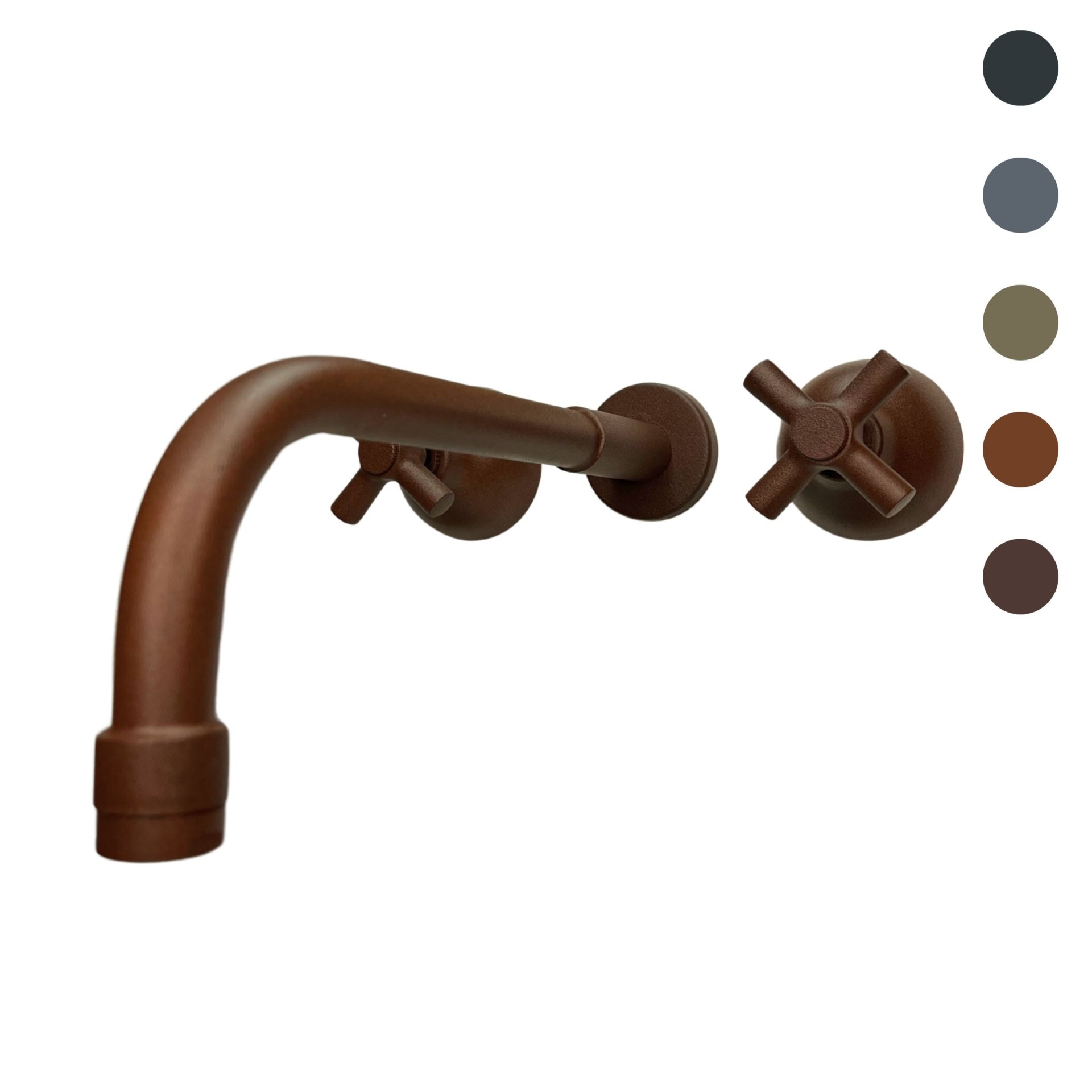 Misturador de parede da linha Modena com acabamento Aço cortem, ideal para lavabos e banheiros.