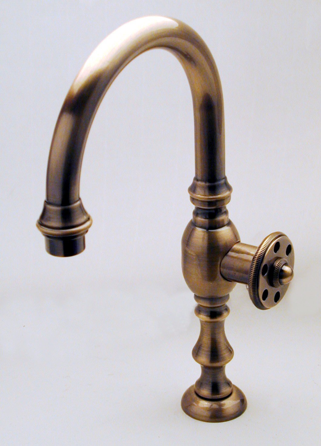 Torneira de bancada da linha Orleans com acabamento Ouro Velho, ideal para lavabos e banheiros. Disponível, também, para cozinha gourmet com arejador articulado.